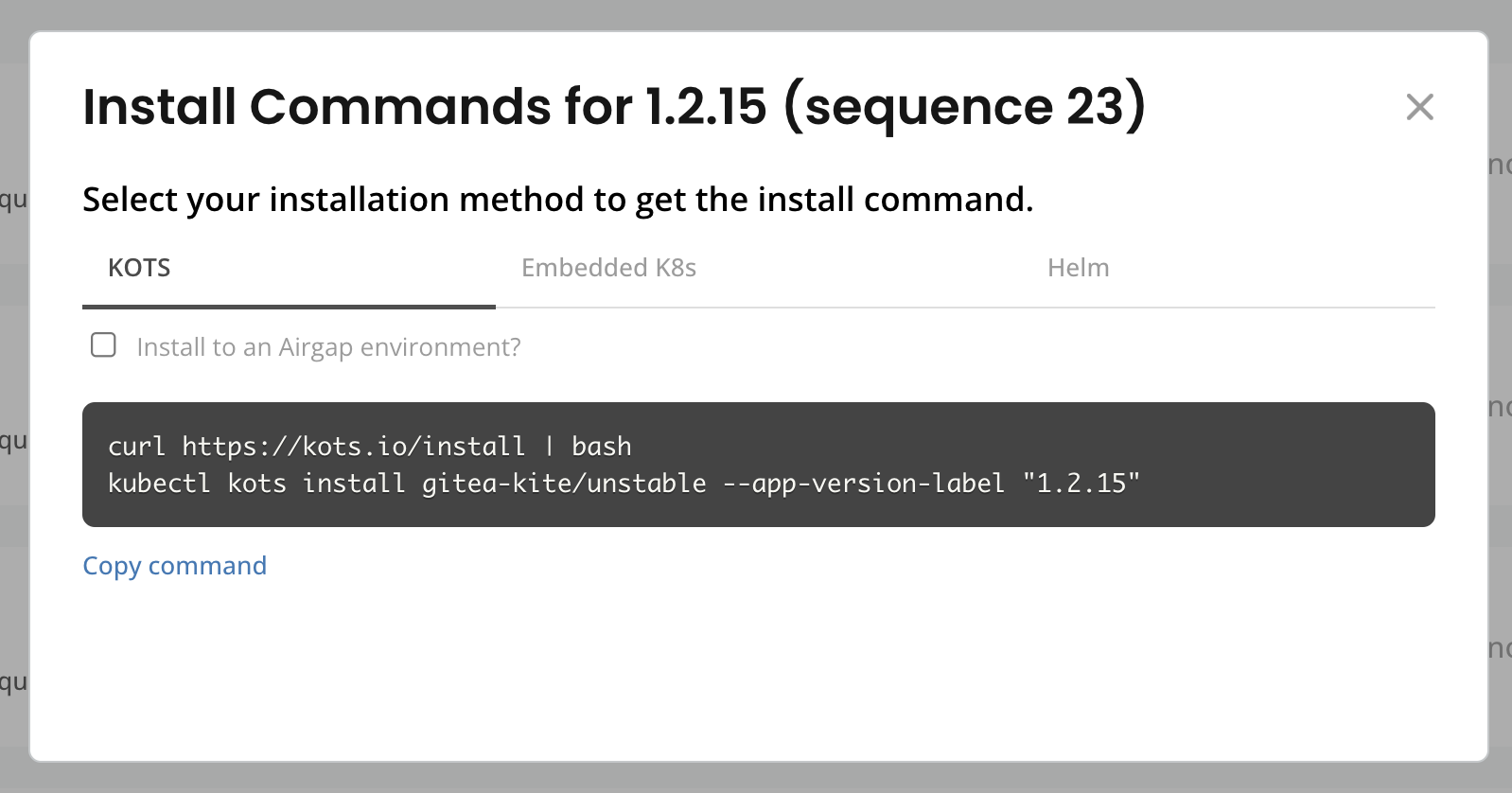 View the command for installing with Replicated KOTS in existing clusters.